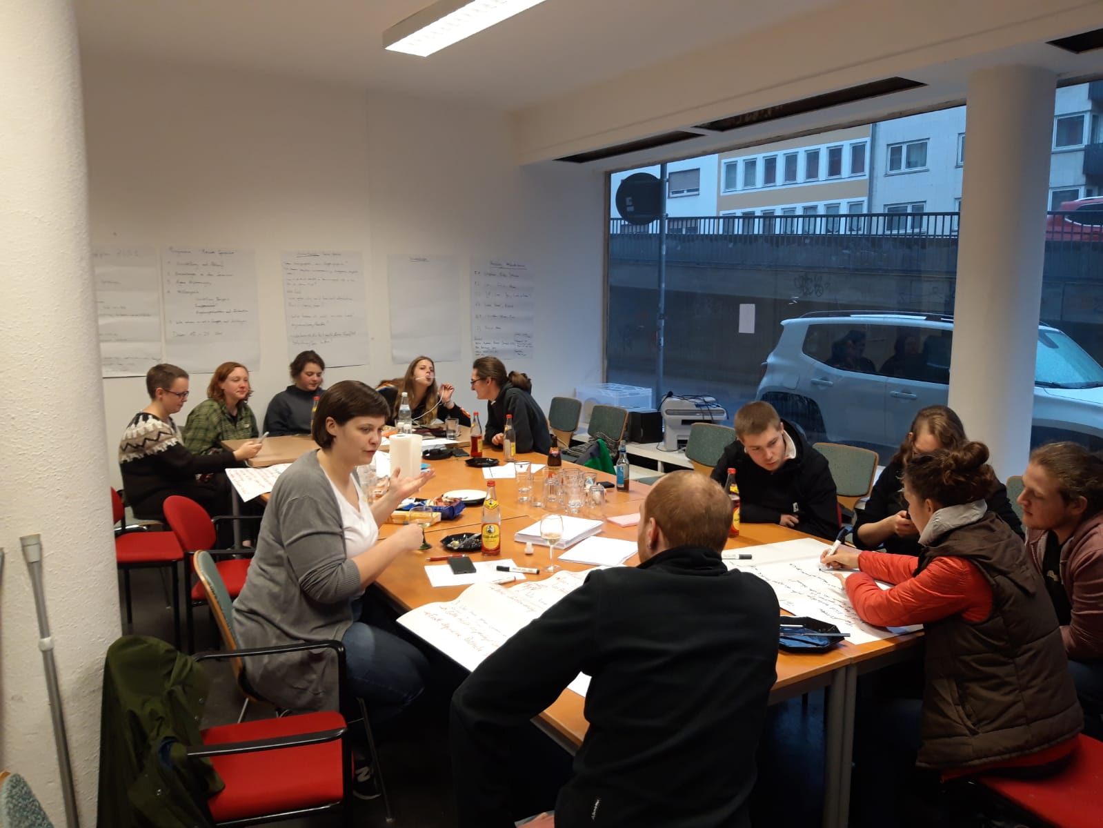 Den Samstag haben wir in erster Linie dazu genutzt, die Einteilung der Helfenden-Teams zu besprechen und anhand von praktischen Aufgaben Eckpunkte unserer Arbeit abzustecken. Anschließend haben wir uns sehr ausführlich mit Zielen und Methoden der antikapitalistischen Pädagogik auseinandergesetzt. Nach einem Einführungsreferat wurden verschiedene Methoden erprobt und in einer Simulation getestet.