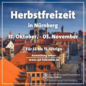 Wir werden in der schönen Stadt Nürnberg im Otto-Felix-Kanitz Haus gemeinsam kochen und wohnen und wohl auch den ein oder anderen Ausflug in die Stadt Nürnberg machen. Inhaltlich werden wir uns mit dem Thema „Krieg und Frieden“ beschäftigen.