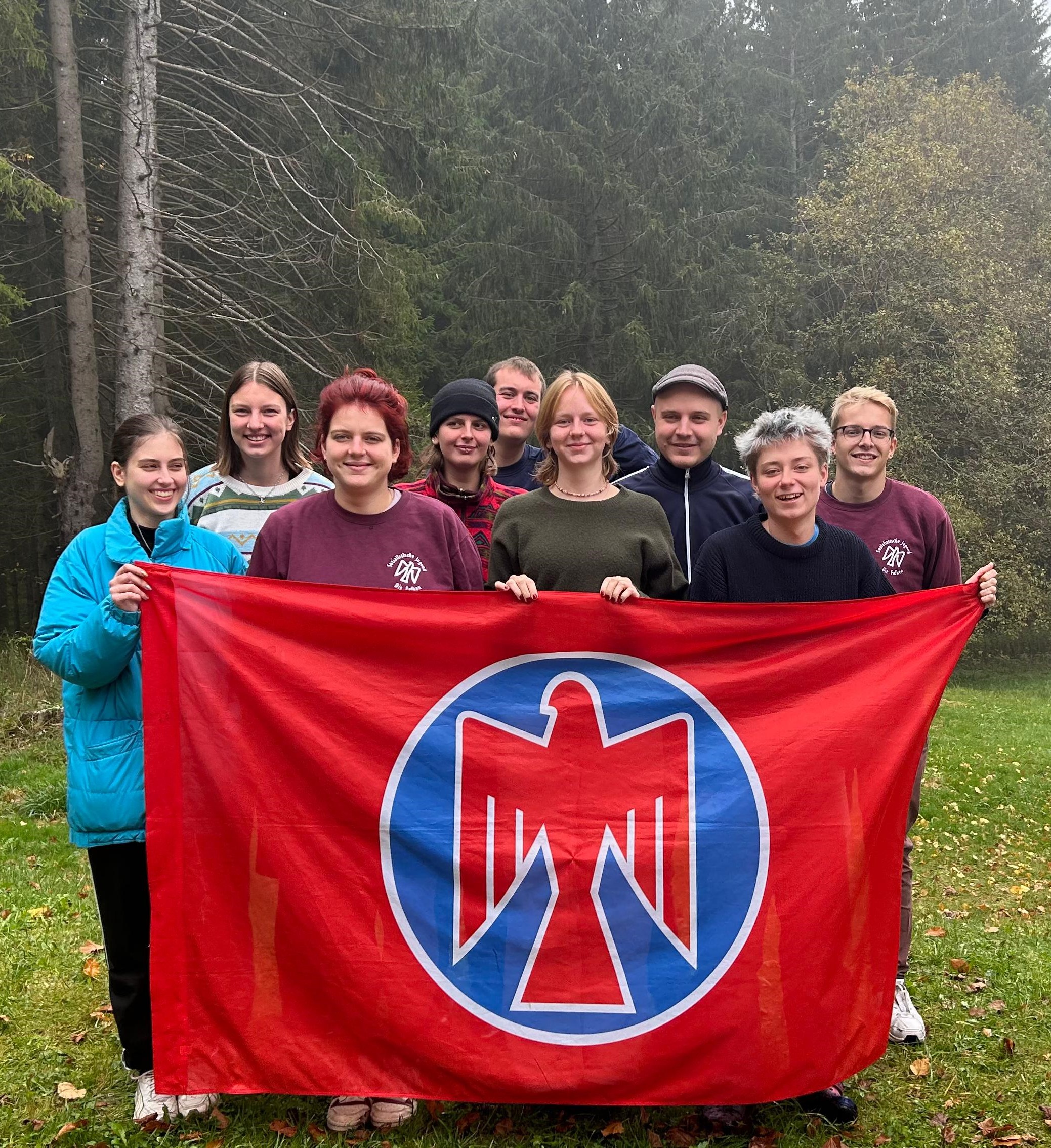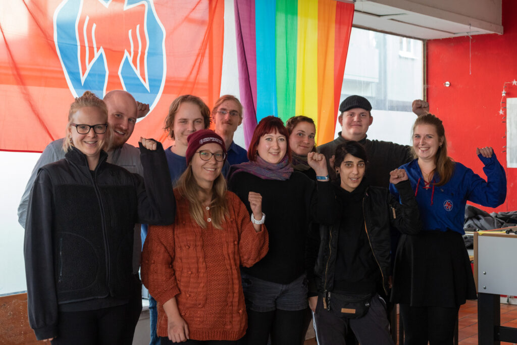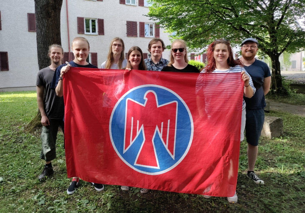 v.l.n.r.: Marie K. (SJ-Ring Beisitz, Heidelberg), Finja (F-Ring-Beisitz, Konstanz), Lea (Landesvorsitz, Mannheim), Johanna (SJ-Ring-Vorsitz, Mannheim), Laurin (F-Ring-Beisitz, Stuttgart), Hannah (F-Ring-Beisitz, Konstanz), Felix (Landesvorsitz, Heidelberg), Coco (SJ-Ring-Beisitz, Freiburg), Bastian (F-Ring-Vorsitz, Mannheim). Es fehlt: Marie T. (SJ-Ring-Beisitz, Heidelberg)